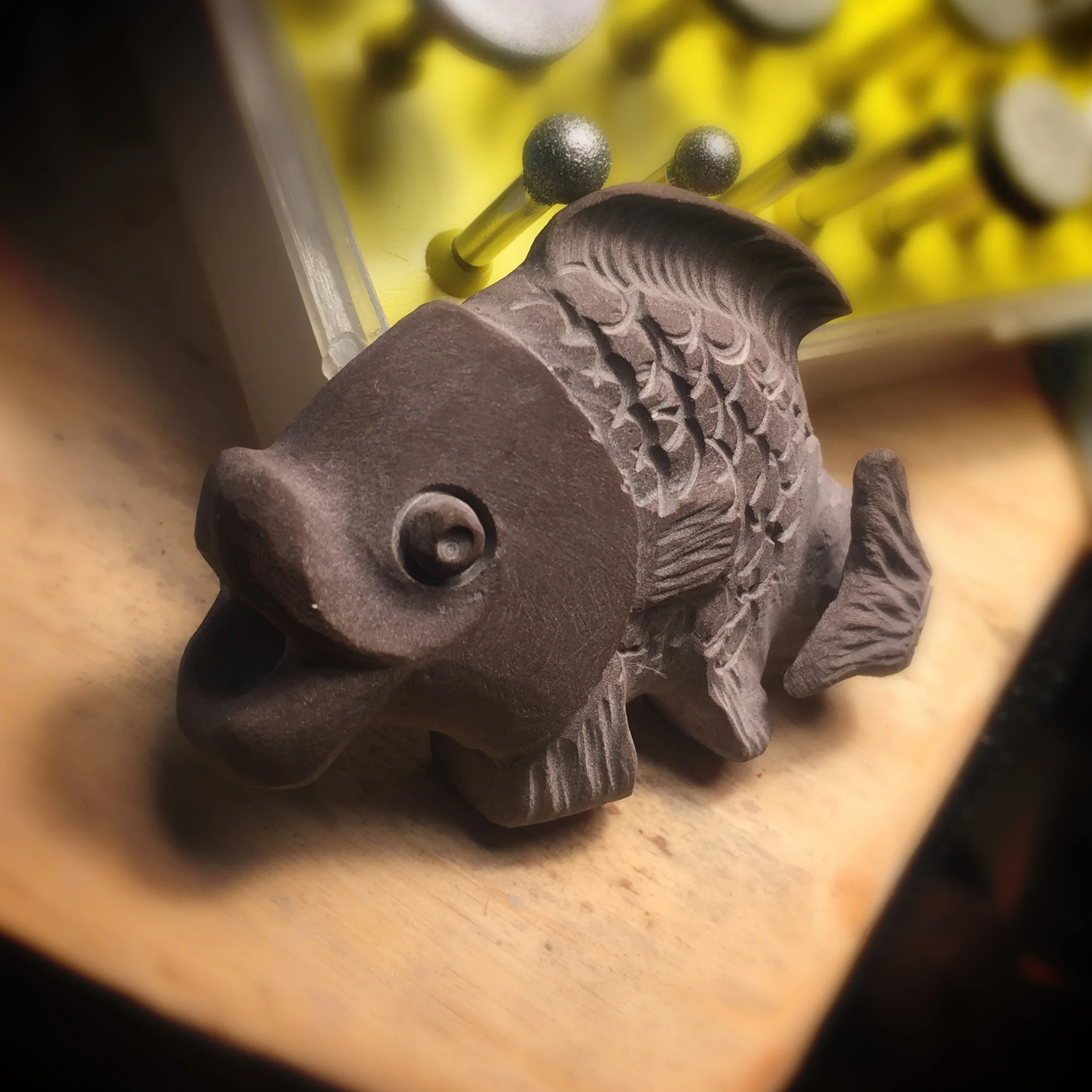 This project was a commission for collector that wanted a pocket stone that was unique. Again, much like Rocktopus, I choose something soft to carve into the stone. Little Fish was carved from a pebble I found while walking home one afternoon. It was a different color from all the other rocks around it and so I snagged it and immediately saw the form come to life in my hands.